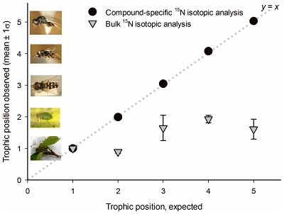 Abstract: Food web ecologists have long sought to characterize the trophic niches of animals using stable isotopic analysis. However, distilling trophic position from isotopic composition has been difficult, largely because of the variability associated with trophic discrimination factors (inter-trophic isotopic fractionation and routing). We circumvented much of this variability using compound-specific isotopic analysis (CSIA). We examined the 15N signatures of amino acids extracted from organisms reared in pure culture at four discrete trophic levels, across two model communities. We calculated the degree of enrichment at each trophic level and found there was a consistent trophic discrimination factor (~7.6‰). The constancy of the CSIA-derived discrimination factor permitted unprecedented accuracy in the measurement of animal trophic position. Conversely, trophic position estimates generated via bulk-15N analysis significantly underestimated trophic position, particularly among higher-order consumers. We then examined the trophic hierarchy of a free-roaming arthropod community, revealing the highest trophic position (5.07) and longest food chain ever reported using CSIA. High accuracy in trophic position estimation brings trophic function into sharper focus, providing greater resolution to the analysis of food webs.
