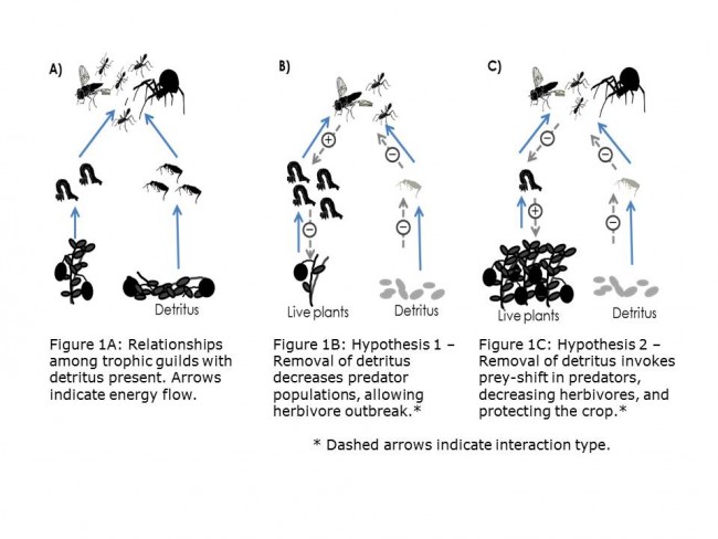 Background: Biological pest control is predicated on the concept that plants can be protected effectively when carnivores suppress herbivore populations. This represents the classical type of trophic cascade, in which plant biomass is indirectly rescued by the activities of predators (Carpenter et al. 1985). However, ecosystems are subject to a variety of factors which may influence community interactions, and food webs in nature consist of a complex interplay of interacting individuals. Carnivorous species, for instance, are known to frequently attack and eat fellow carnivores—a behavior known as intra-guild predation (Polis 1991). The prevalence of omnivory and intra-guild predation in a system may diminish the strength of the trophic cascade (Polis and Strong 1996, Finke and Denno 2005). When a cascade is dampened, the ostensibly “beneficial” species become much less effective, and the resultant crop protection can be greatly undermined.